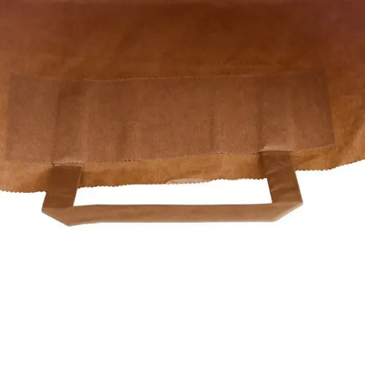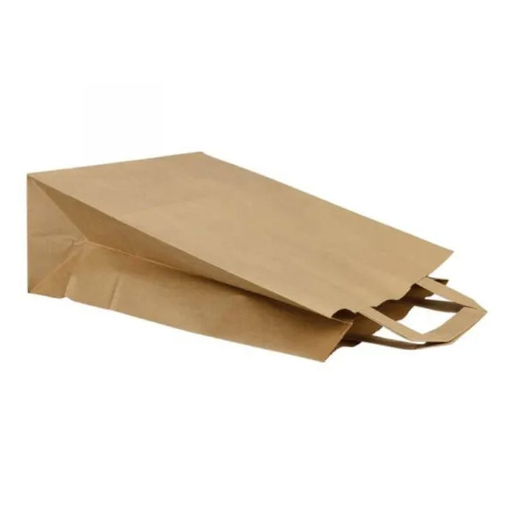 Kraft papierová taška s plochými kľučkami papiera sa môže použiť v odvetví stravovania, v supermarkete a ako darčeky. Sú vyrobené z robustných a odolných materiálov, môžu sa niekoľkokrát znovu použiť, sú kompostovateľné a biologicky odbúrateľné.